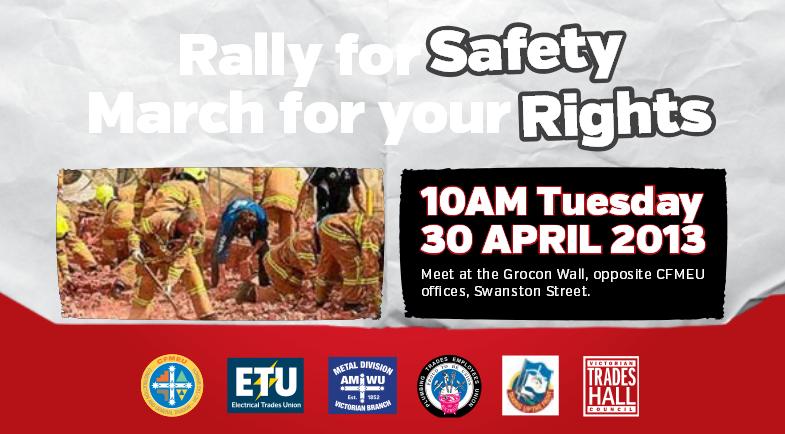 The CFMEU (Construction Forestry Mining Employees Union) and Victoria’s Trade Unions will be marching next Tuesday April 30 in support of Safety on Melbourne’s Building sites. The march will start at 10AM outside the GroCon CUB building site on Swanston Street.