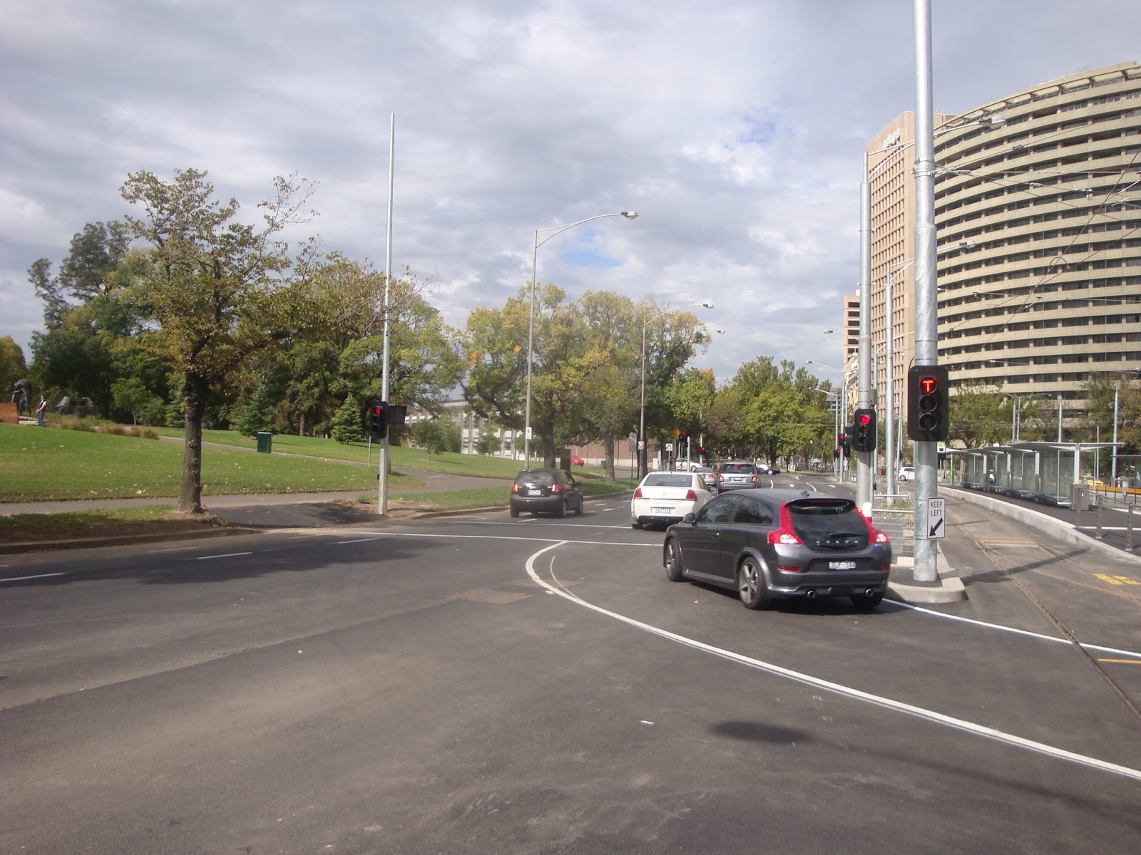 Cars exiting Park Street tuning right into St Kilda Road left in the dark as to the state of the traffic light once they cross the center road divide..