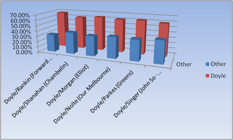 The following Two Candidate Preferred (2CP) statistics show Robert Doyle the clear winner against all candidates